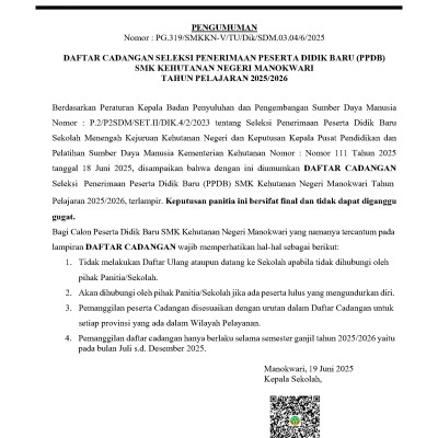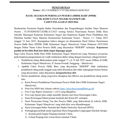 PENGUMUMAN NOMOR : PG.271/SMKKN-V/Pg.O.3/SSM.03.0.4/10/2025 HASIL SELEKSI AKHIR PENERIMAAN PAMONG SISWA SMK KEHUTANAN NEGERI MANOKWARI TAHUN 2025/2026 Berdasarkan hasil dari serangkaian proses seleksi administrasi,