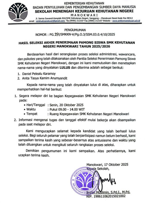 PENGUMUMAN NOMOR : PG.271/SMKKN-V/Pg.O.3/SSM.03.0.4/10/2025 HASIL SELEKSI AKHIR PENERIMAAN PAMONG SISWA SMK KEHUTANAN NEGERI MANOKWARI TAHUN 2025/2026 Berdasarkan hasil dari serangkaian proses seleksi administrasi, wawancara, dan psikotes yang telah dilaksanakan oleh Panitia Seleksi Penerimaan Pamong Siswa SMK Kehutanan Negeri Manokwari, dengan ini kami memutuskan dan menetapkan nama-nama yang dinyatakan LULUS dan diterima adalah sebagai berikut: 1. Daniel Pelealu Karamoy 2. Anita Tasya Kamim Anumyandit Kepada nama-nama yang telah dinyatakan lulus di atas, diharapkan untuk memperhatikan hal-hal berikut: 1. Segera melapor diri ke bagian Kepegawaian SMK Kehutanan Negeri Manokwari pada: • Hari/Tanggal : Senin, 20 Oktober 2025 • Waktu : Pukul 09.00 - 14.00 WIT • Tempat : Ruang Kepegawaian SMK Kehutanan Negeri Manokwari 2. Informasi mengenai tugas dan tanggal efektif mulai bekerja akan disampaikan pada saat melapor diri. Kami mengucapkan selamat kepada kandidat yang telah berhasil lulus seleksi. Bagi seluruh pelamar yang telah berpartisipasi namun belum berhasil, kami sampaikan terima kasih yang sebesar-besarnya atas antusiasme dan waktu yang telah diluangkan untuk mengikuti seluruh rangkaian proses seleksi. Demikian pengumuman ini kami sampaikan. Atas perhatiannya, kami ucapkan terima kasih.